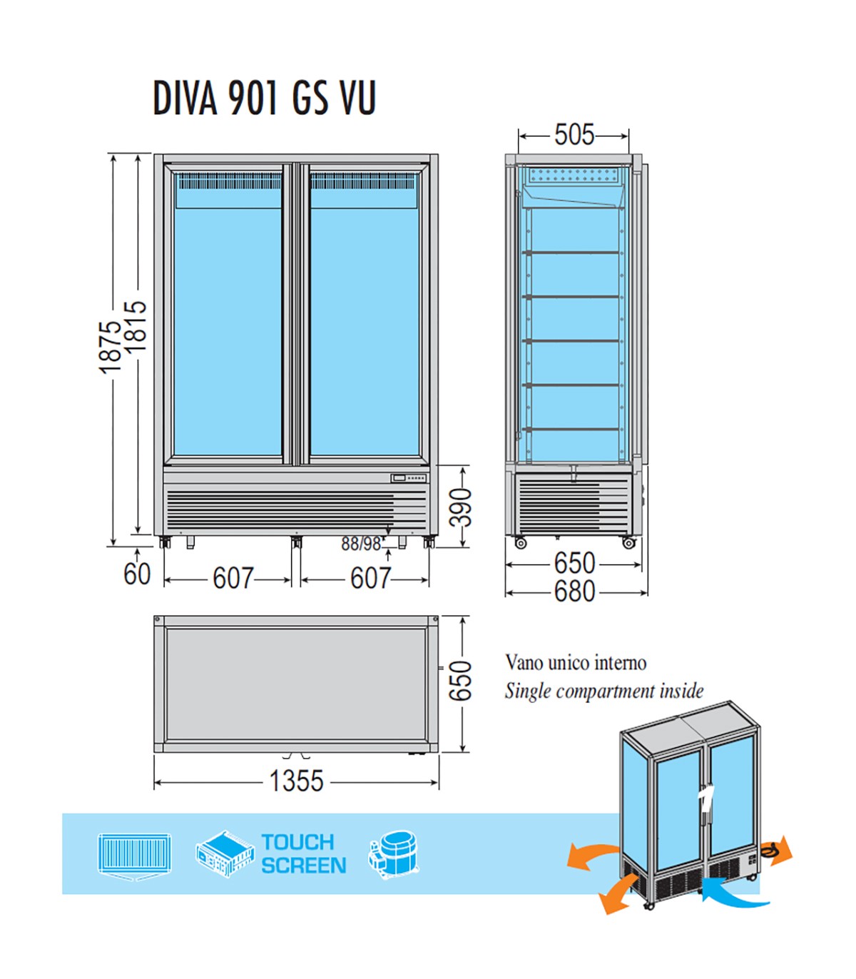 În ceea ce privește detalii tehnice, vitrina are o putere electrică de 0,50 kW și funcționează cu un curent electric de 230V / 50Hz / 1N.